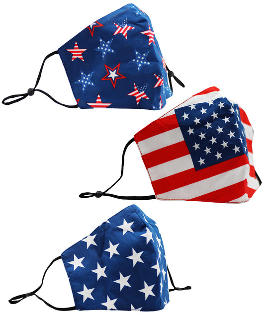 Norty 3 Pack USA Flag Cotton Face Covering Adult Washable Reusable 3 Layer Premium Face Mask Patriot Stars and Stripesatriot
