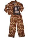 Duck Dynasty - Little Boys Long Sleeve Duck Dynasty Pajamas, Brown, Tan, Coat Style Top, Piping Trim, Button Front, Full Elastic Waisband Pant, Allover The Quack Pack Duck Dynasty Print, Flame Resistant, 100% Polyester, Made in China, #36280 36-280