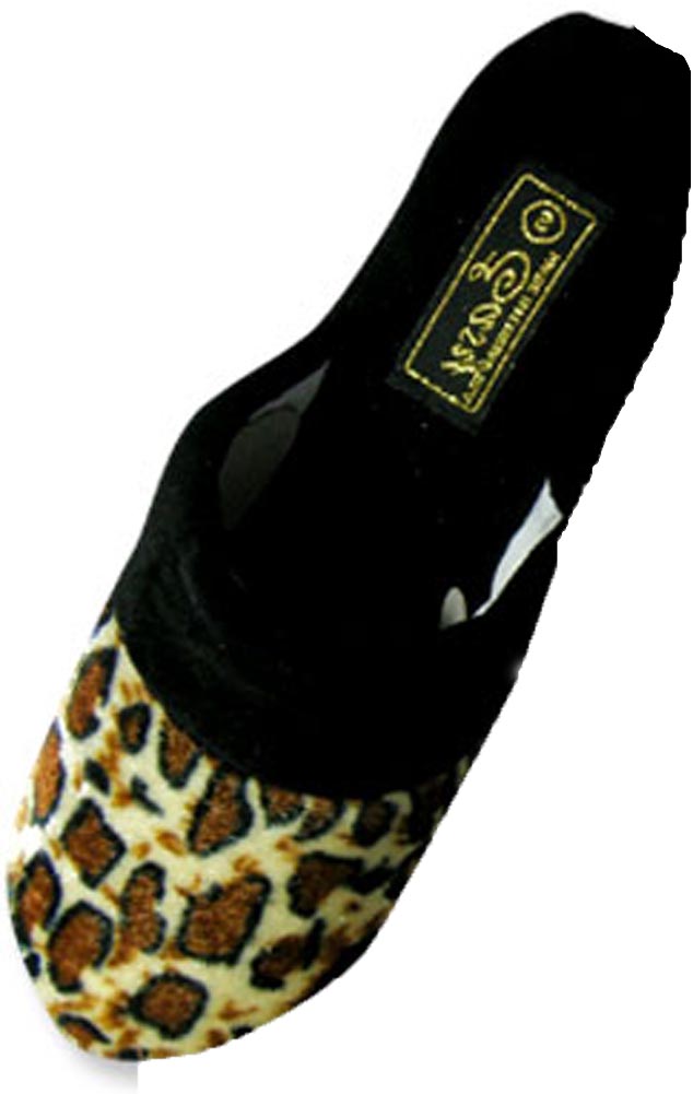 Easy USA - Ladies Slipper, Black, Slip On With Open Back, Leopard Print, Size S=5/6, M=7/8, L=9/10, XL=11/12, Rubber Sole, #14866