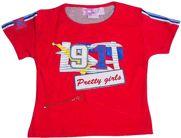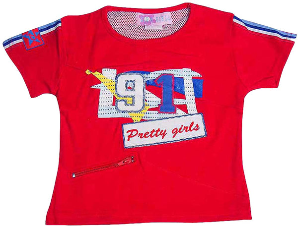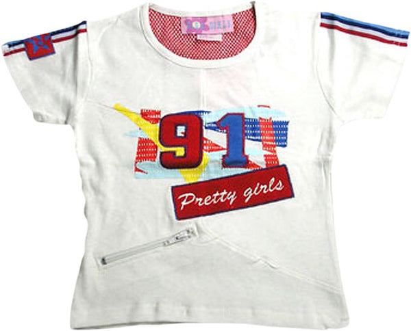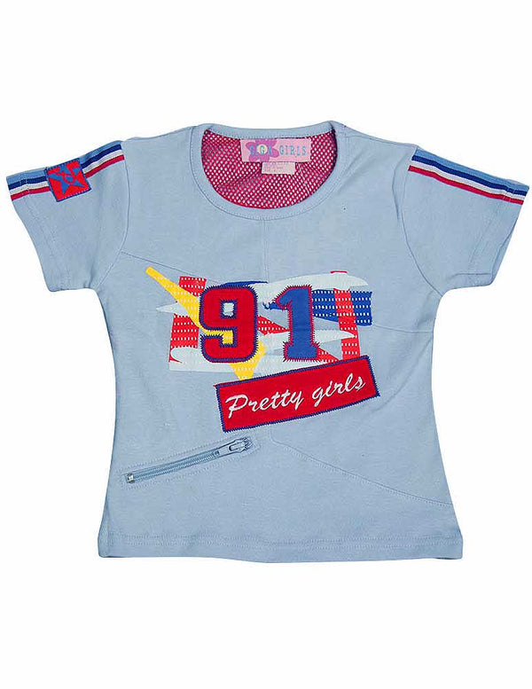 Giga Girls Short Sleeved Tee, Lt. Blue, Red, with Decorative Zipper, and '91' and 'Pretty Girl' Patch, 55% Rami, 45% Cotton, Machine Wash, #4593