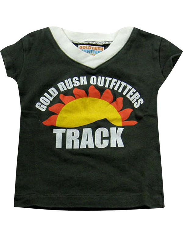 Gold Rush - Girls Cap Sleeve T-Shirt, Distressed Black, White, Ribbed V-Neck, Logo'd TRACK Screen Print With Sun, 100% Cotton, #17126