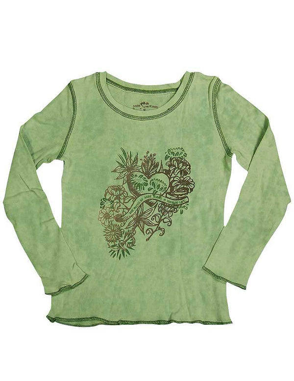 Jade - Girls Long Sleeved Tee, Olive, Brick, Tie Dye, Exposed Stitching, Heart and Flower Design, 100% Cotton, #7819