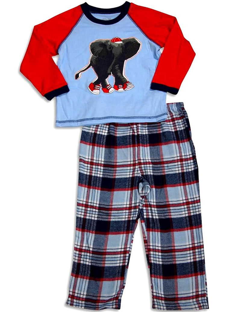 Little Me - Toddler Boys Long Sleeve Pajamas, Light Blue, Red, Navy, Long Sleeve Top With Elephant Screen Print and Embroidery, Color Blocked, Ribbed Neck and Wrists, Contrast Stitching, Plaid Pant to Match, Full Elastic Waistband, Flame Resistant, 100% Polyester, Made In Cambodia, #30768 30-768