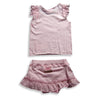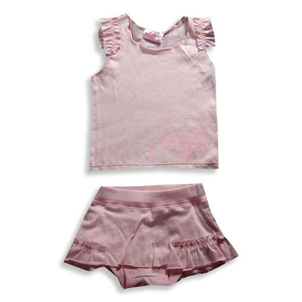 Mish - Infant Girls Skort Set, Pink, Scoop Neck Top, Ruffled Shoulders, Screen Printed Butterfly, Skort has Ribbed Elastic Waistband, Matching Ruffles, 100% Cotton, Made In Israel, #17855