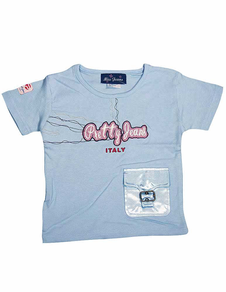 Miss Jeans - Girls Short Sleeved Tee, Lt. Blue with Satin Pocket with Brass Buckle and 'Pretty Jeans Italy' Embroidery, 55% Rami, 45% Cotton, Machine Wash, #4571