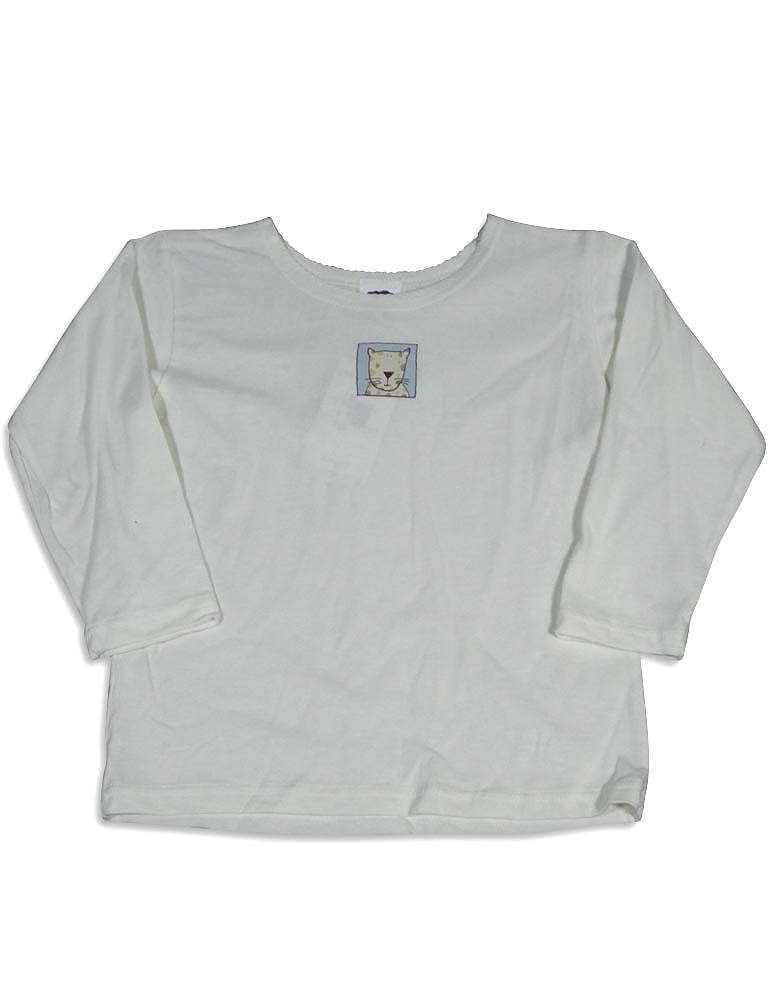 Mulberribush - Girls Long Sleeve Cat Shirt, Cream, Picot Stitching Neck, Screen Printed Cat Graphic, 100% Cotton, Made In USA, #26940 26-940