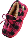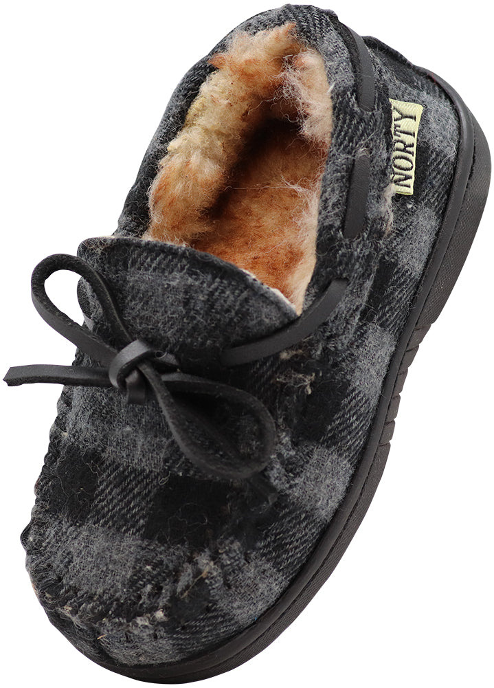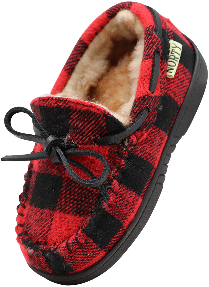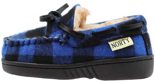 Norty - Boys' Girls' Unisex Kid Buffalo Plaid Fleece Upper Moccasin Slippers, Faux fur lining with a cushioned footbed, Leather lacing and whipstitch trim, Luxurious and warm, Great for indoor/outdoor use, 65% Cotton 35% Polyester upper balance man made, Made in China, #40918