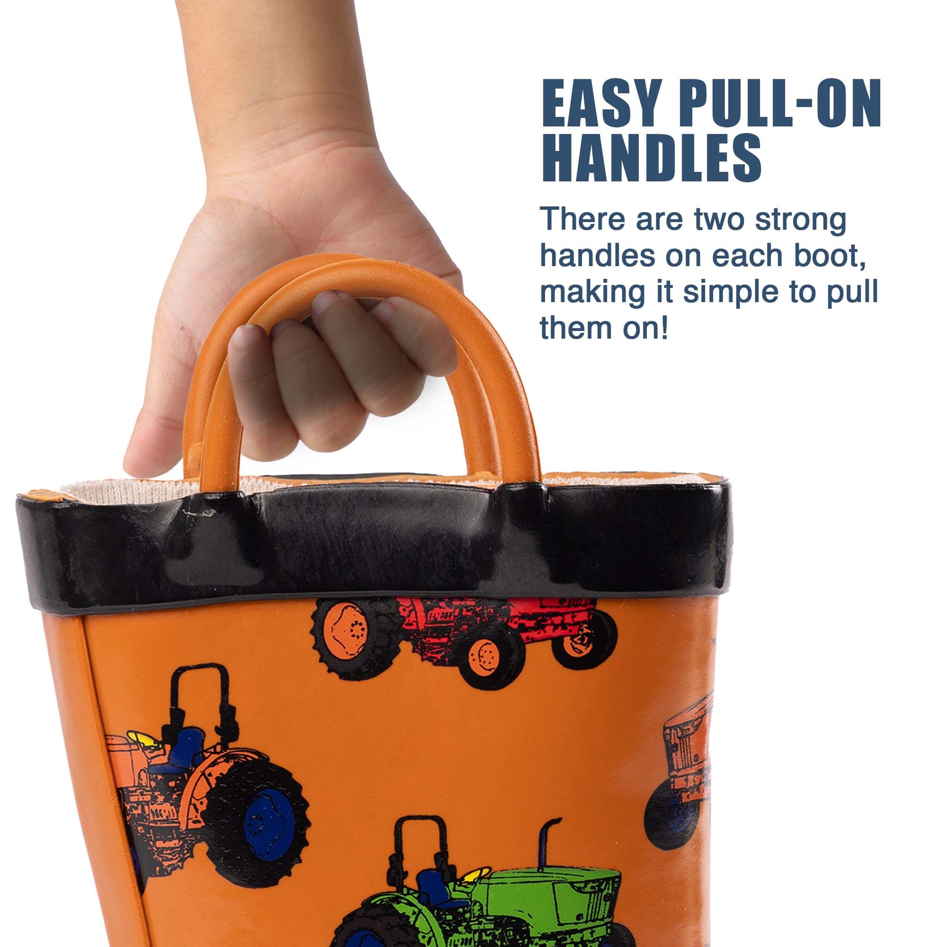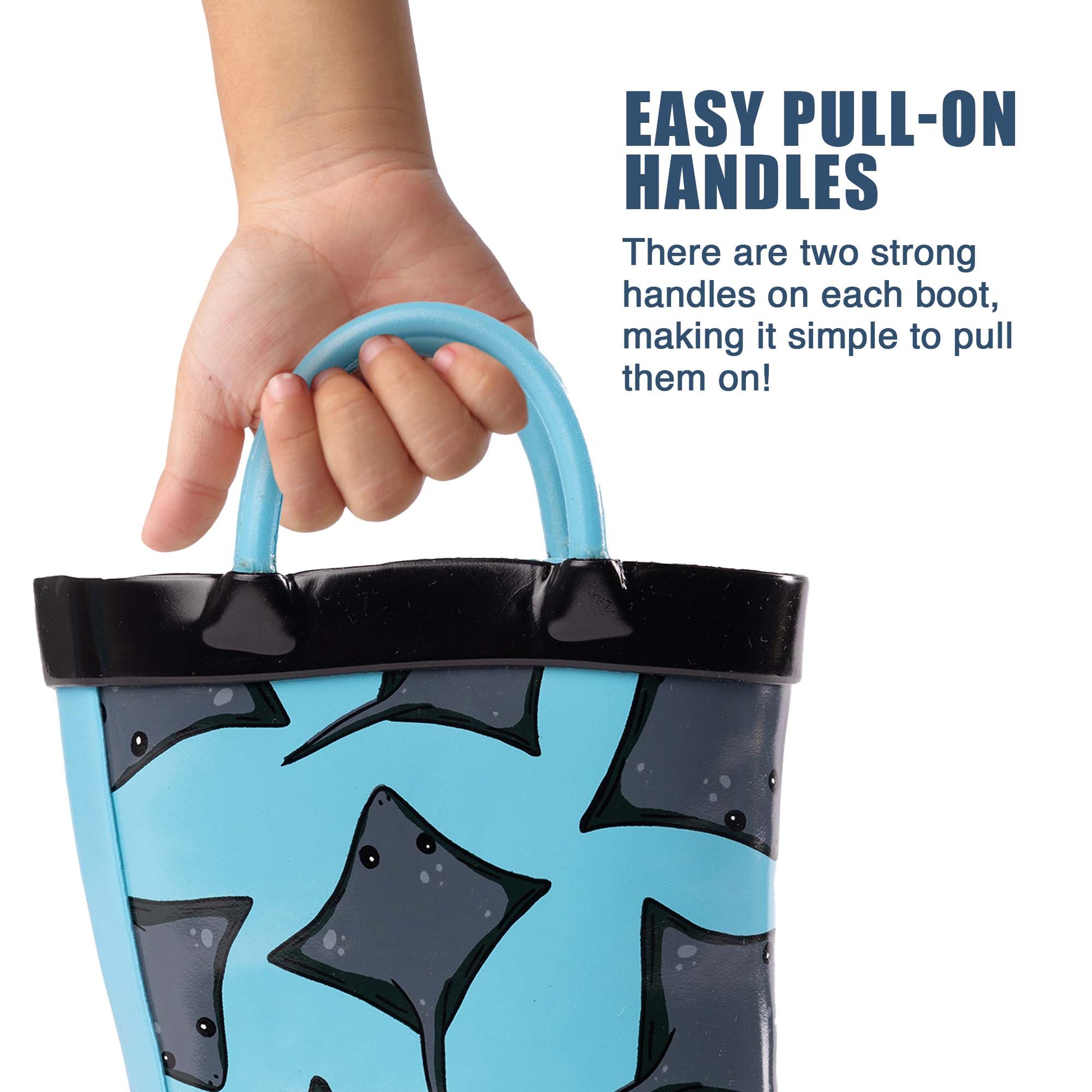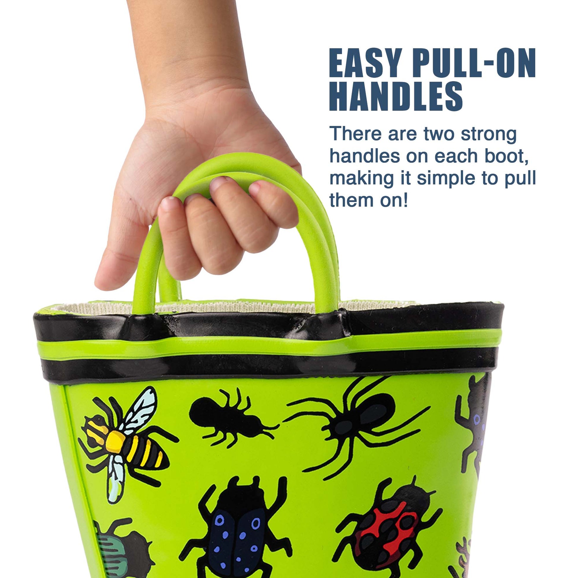- FUN HANDLES MAKE THESE EASY TO PULL ON: Kids have a great time using the big rubber handles to pull these rubber rainboots on all by themselves. Your Child's Small hands will have no problem grasping these bright rubber tubes.
