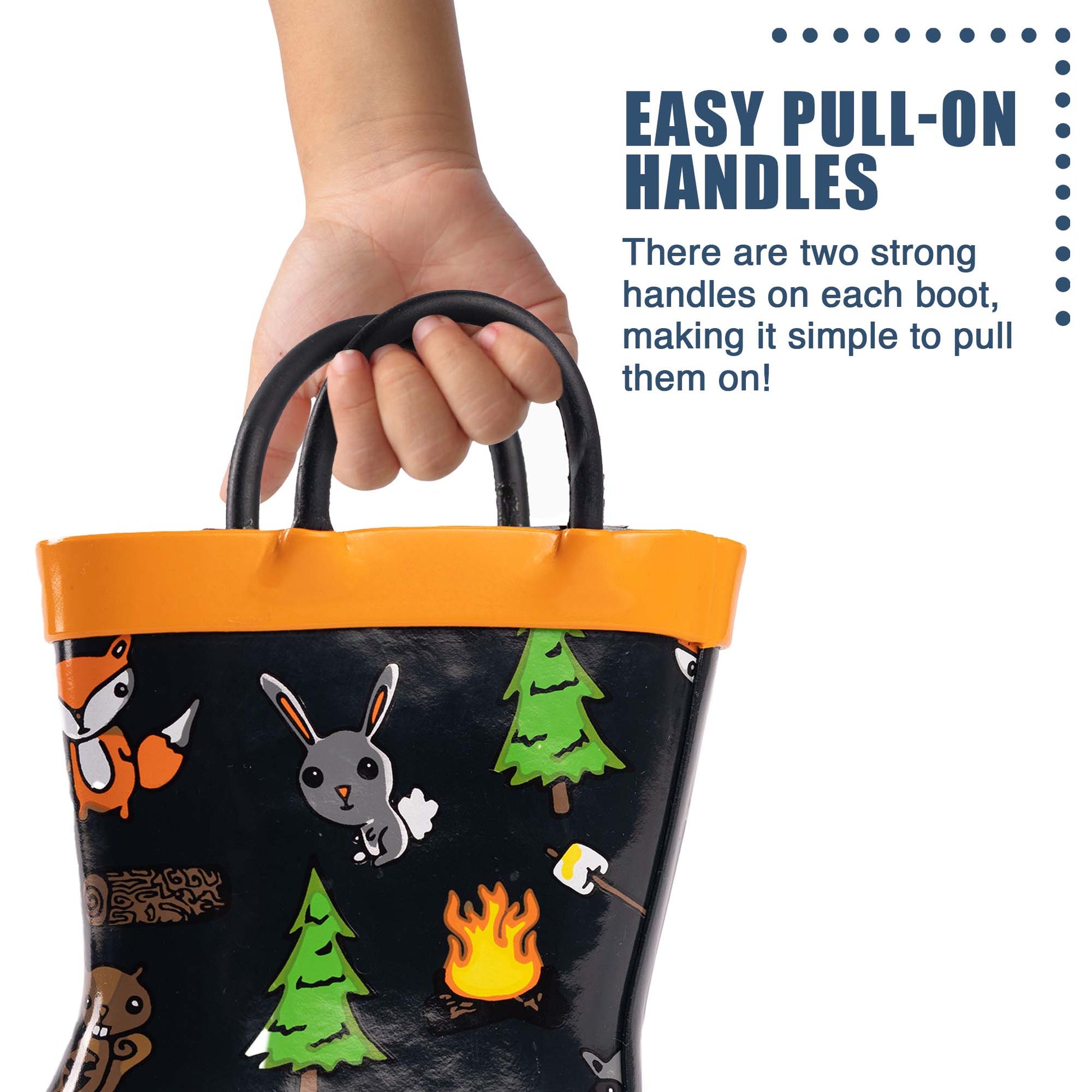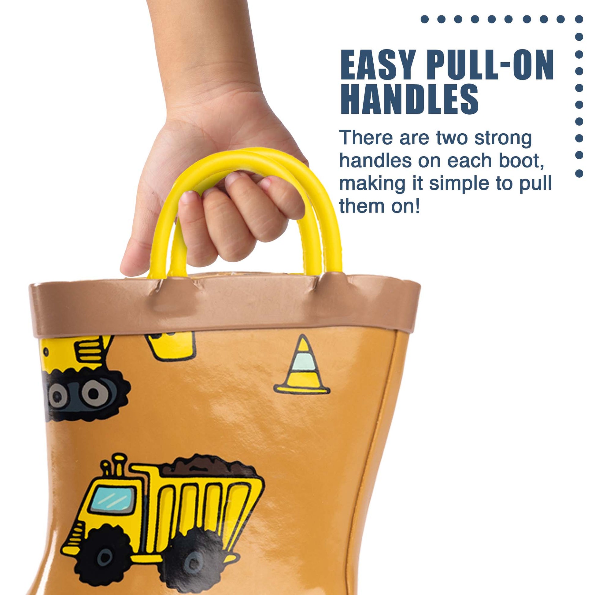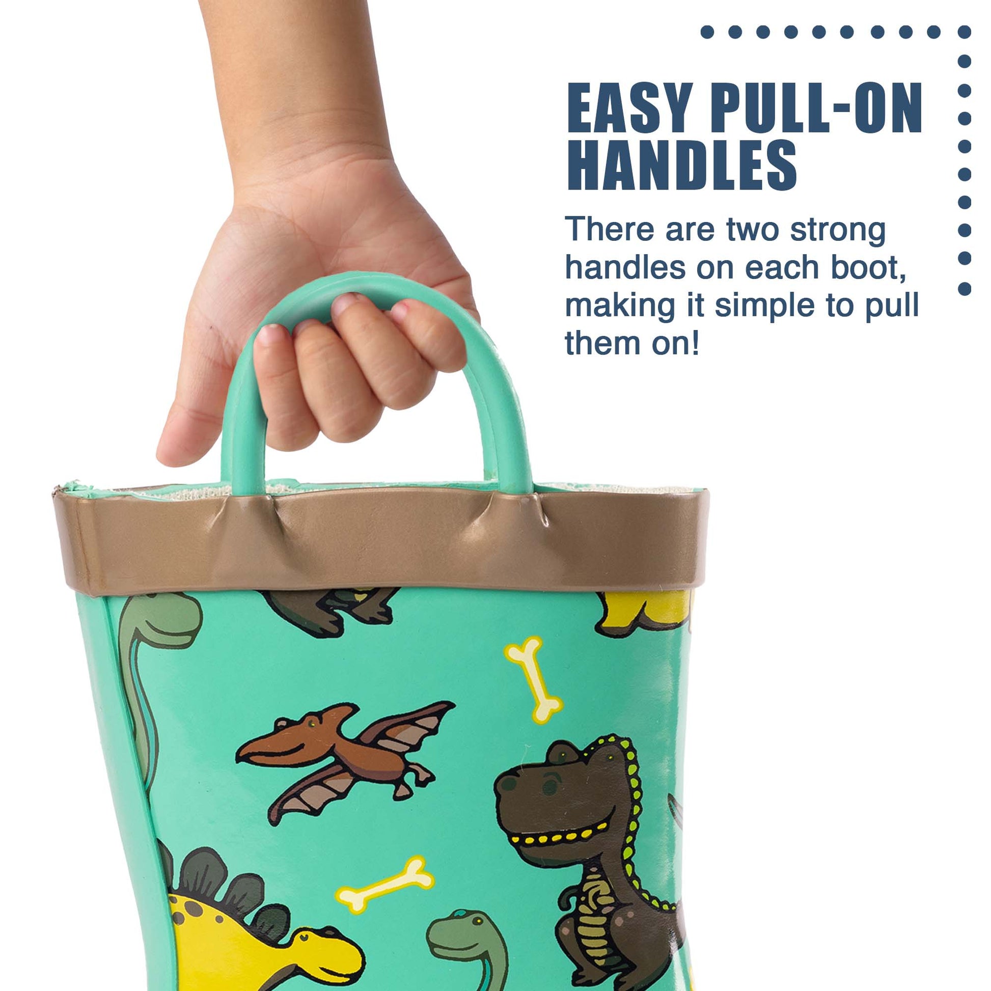 - FUN HANDLES MAKE THESE EASY TO PULL ON: Kids have a great time using the big rubber handles to pull these rubber rainboots on all by themselves. Your Child's Small hands will have no problem grasping these bright rubber tubes.