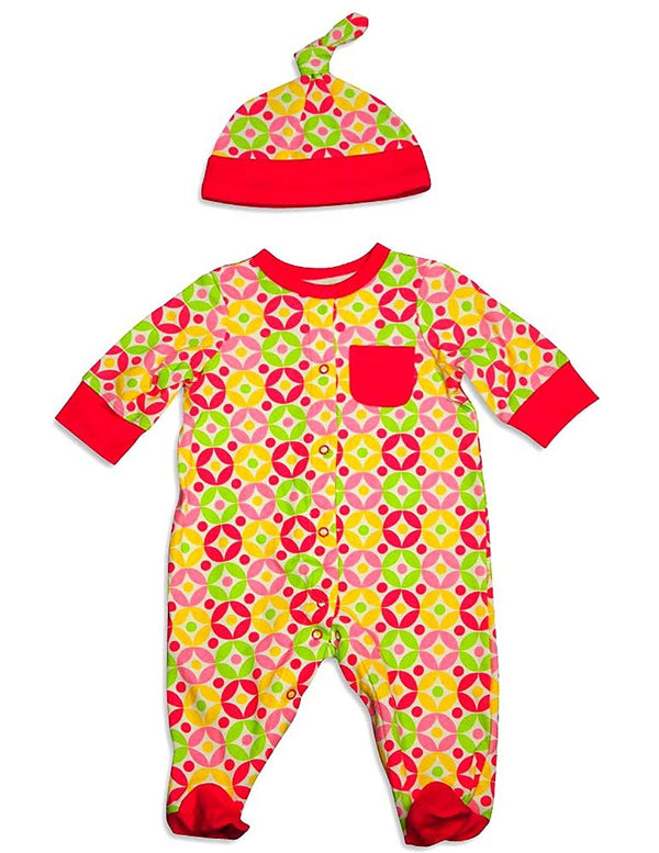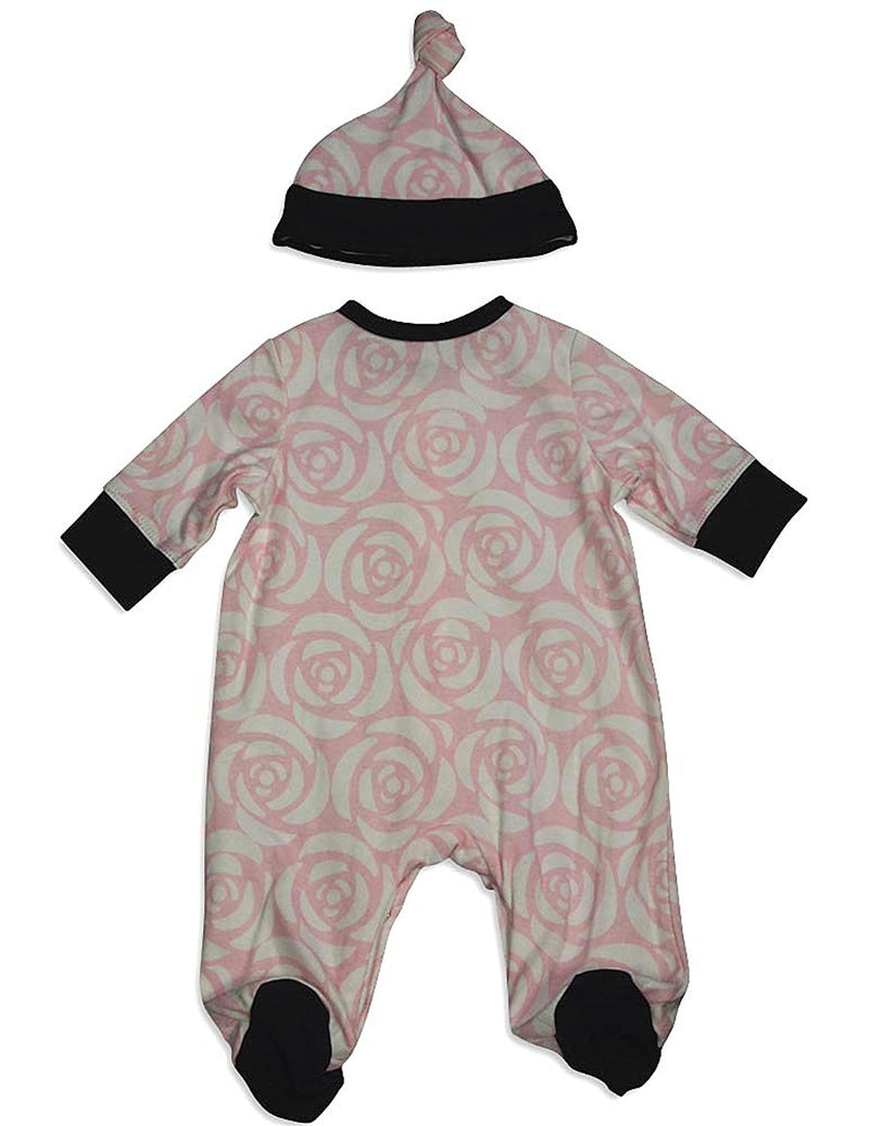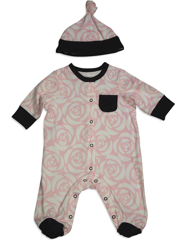 Precious and sweet she will be in this rose print footed coverall, Long sleeves with snaps down the front and inside leg snaps to make diaper changing easy, Matching cap, Made in China of 100% cotton, Machine wash and dry recommended