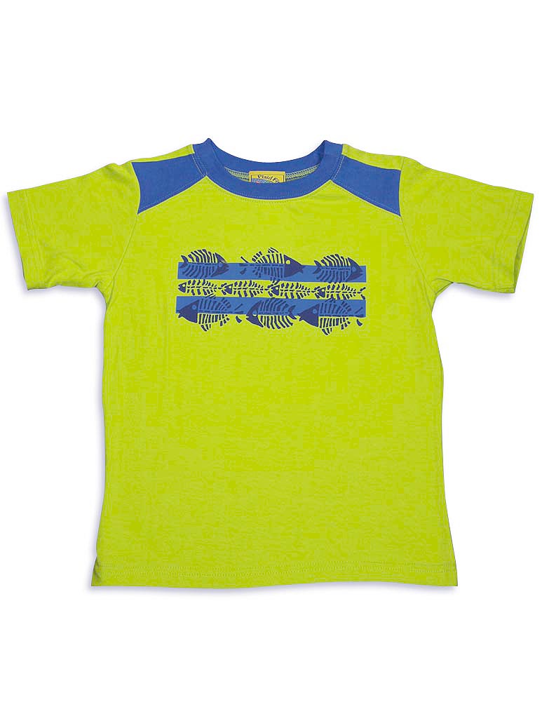 Plaid Fish - Boys Short Sleeve T-Shirt, Lime, Blue, Ribbed Neck, Fish Bones Graphic, 100% Cotton, Made In Israel, 29901 29-901