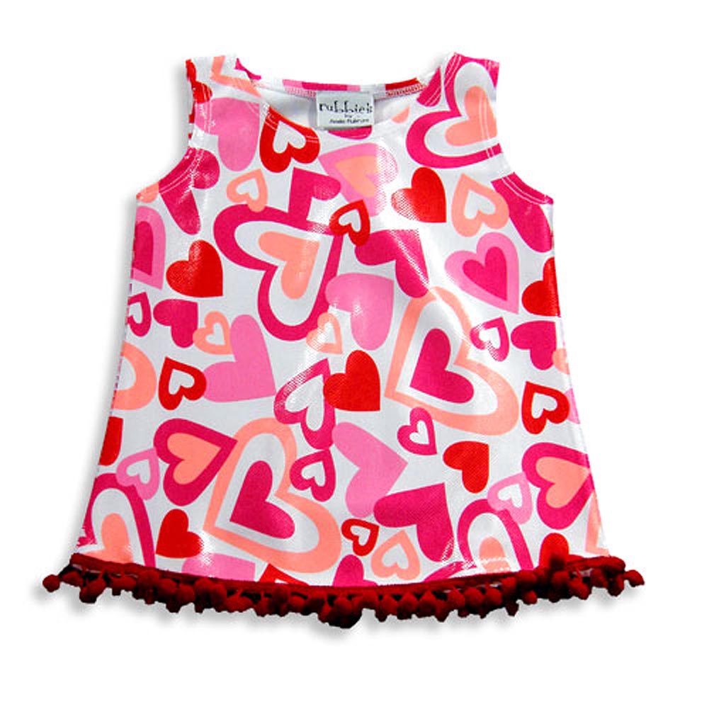 Rubbies - Infant Girls Sleeveless Coverup Dress, White, Pink, Red, Heart Print With Shimmer, Pom-Pom Fringe Hem, 80% Polyester 20% Spandex, Made In China, #17425