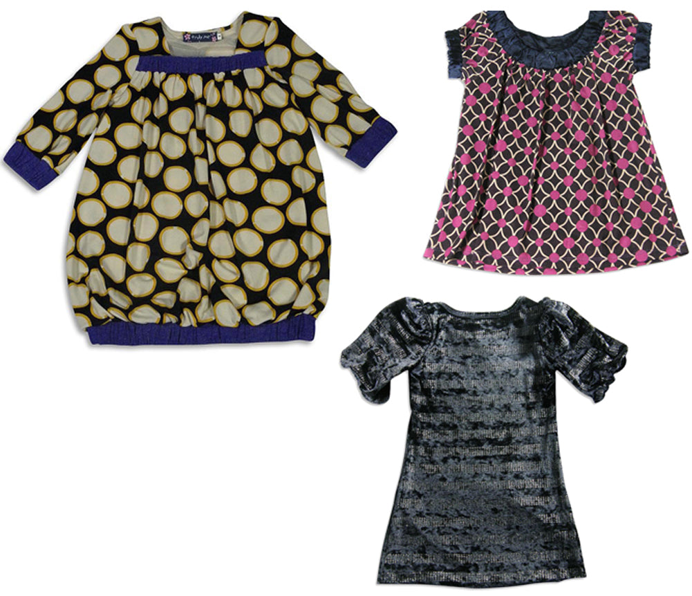 - SWEET DESIGNS WITH FUN AND GREAT STYLE - 3 Styles for her to be herself - navy print with satin trim and fully lined (96% polyester 4% spandex), blue velour tone on tone metallic striping 3/4 sleeve (96% polyester 4% spandex) or ivory black and gold circle print on a bubble style body fully lined (50% cotton 50% polyster)