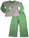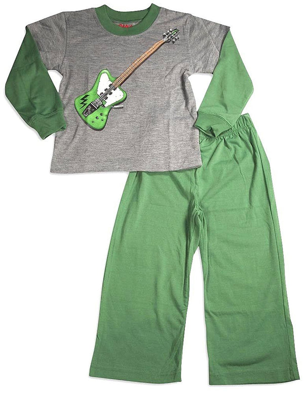 Wes and Willy - Boys Long Sleeve Pajamas, Grey, Green, Long Sleeve Layered Look Top, Ribbed Neck and Cuff Wrists, Guitar Screen Print, Full Elastic Waistband Pant, Flame Resistant, 100% Polyester, Made In China, #29773 29-773