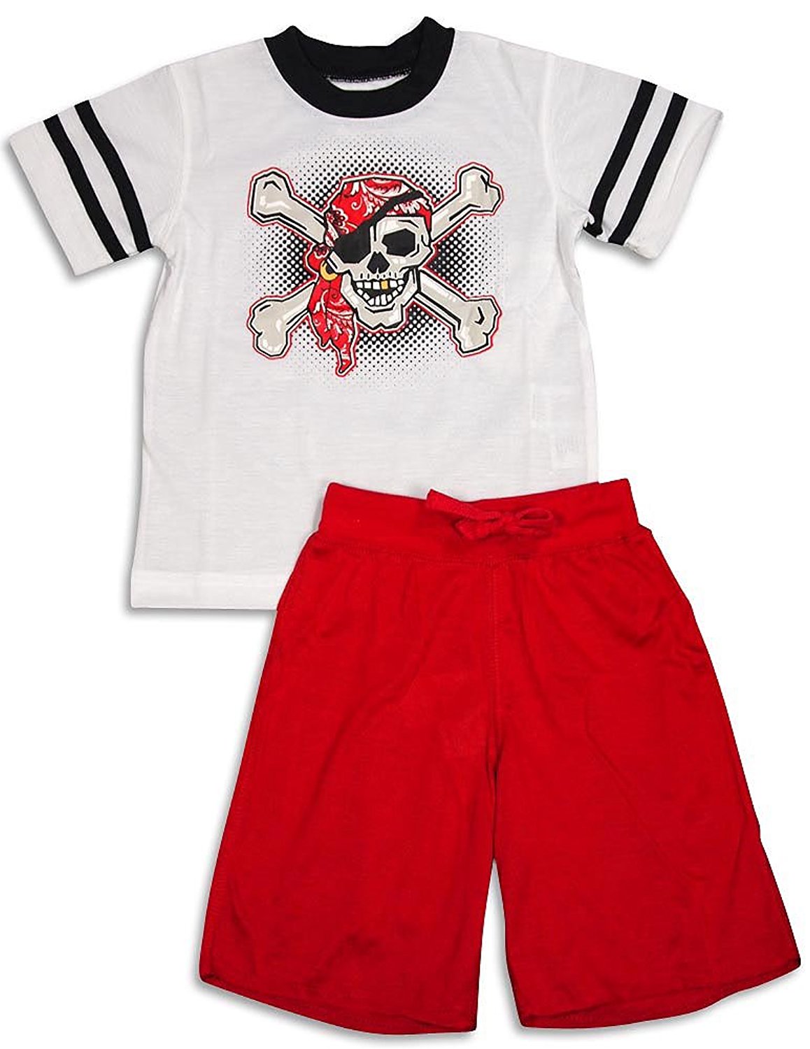 Wes and Willy - Boys Short Sleeve Shortie Pajamas, White, Red, Short Sleeve Top, Ribbed Neck, Pirate Skull Graphic, Full Elastic Wide Ribbed Waistband Short With Drawstring Tie, Cut Hem, Flame Resistant, 100% Polyester, Made In China, #29135 29-135