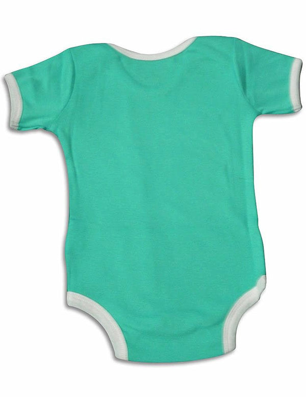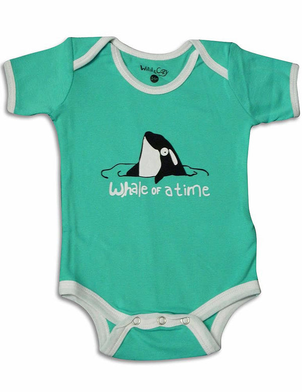 Your baby will look cute in this animal print onesie. It is teal with a killer whale print on the front. It says Whale of a Time. • Wild and Cozy brand• 100% cotton knit• Snaps at the crotch• Machine wash