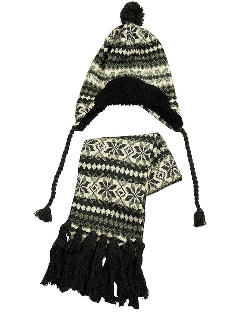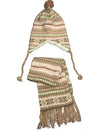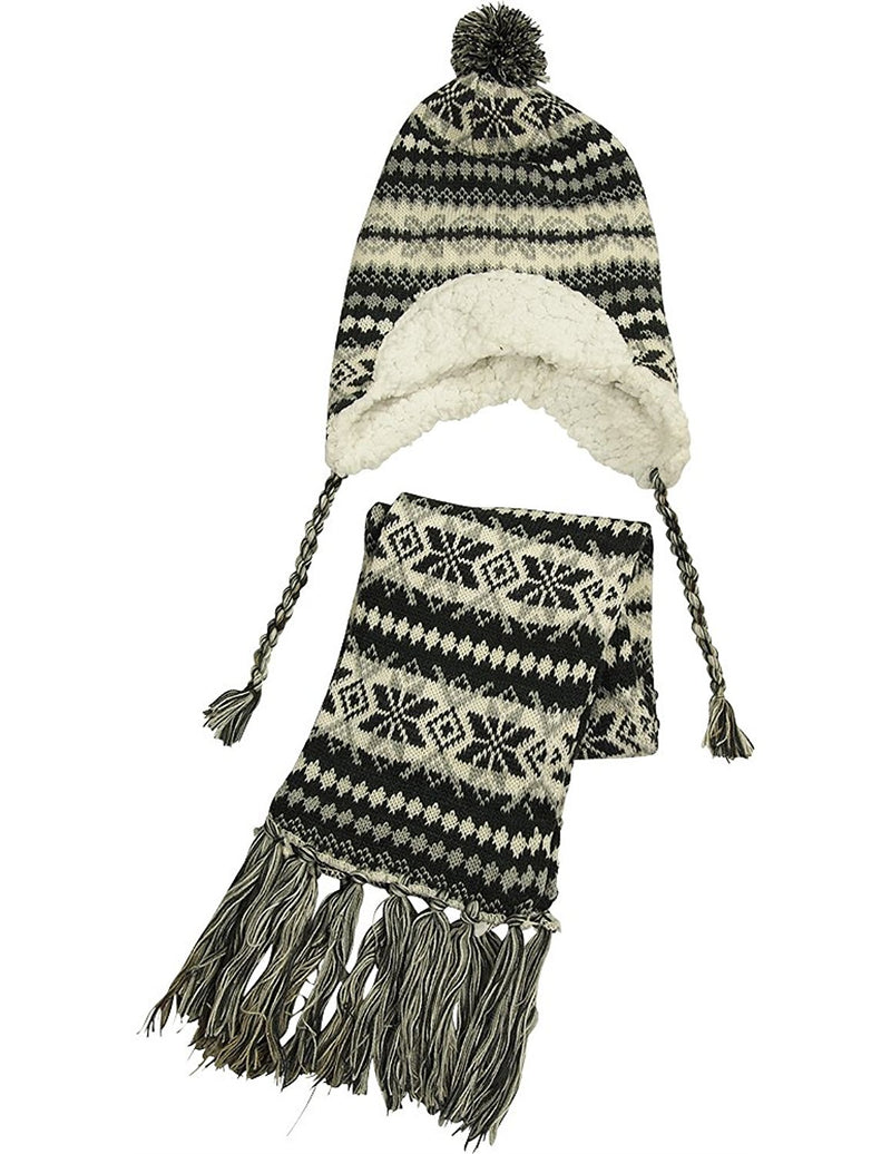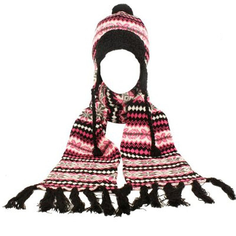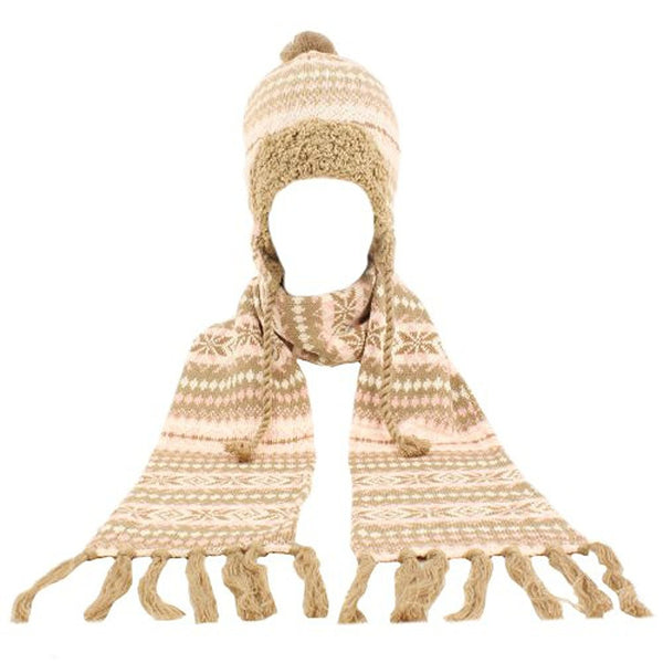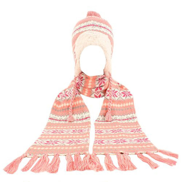 Super soft berber lined snowflake knit girls hat and scarf set, fits girls ages 7-12 (Head measurement: 54 cm, 21-1/4", Size 6-3/8 ~ 56 cm, 22", Size 7 ) and will stretch, Super soft berber lining trapper hat with pom pom top, Side braided tassel with matching snowflake 2ply knit super long scarf. Your child will be super warm & super cute, Great for all outdoor activities, Flat hat measurement: 12" x 9-1/2" Scarf without fringe: 74" x 6-3/8" - super long 2 ply knit Fringe: 4-1/2", Made in China